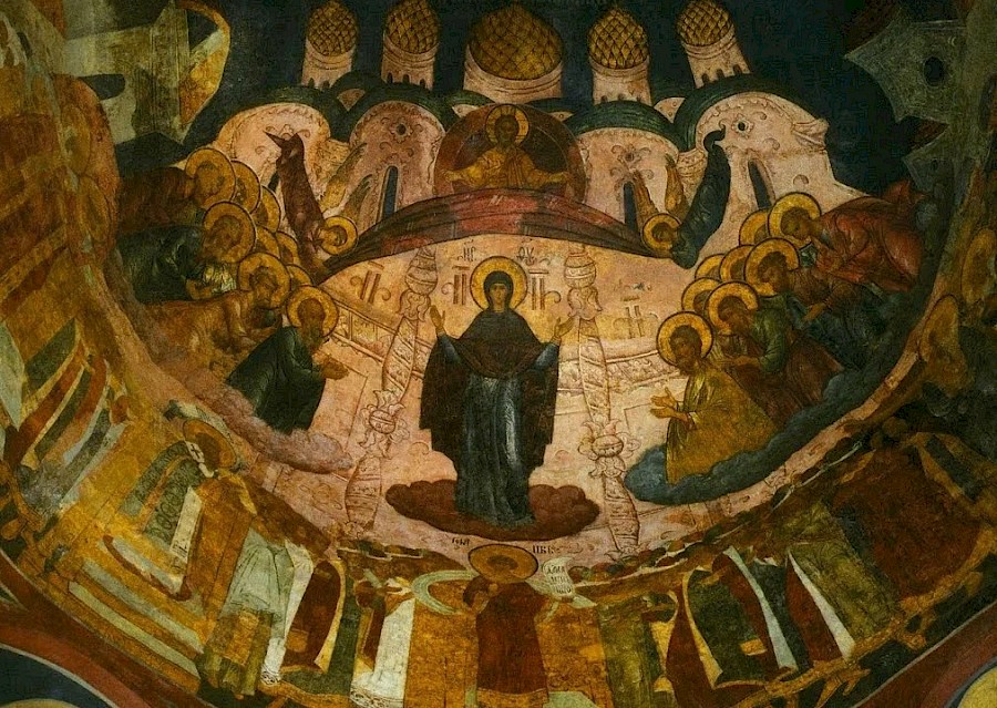 Відкрито лежало сяюче світлом тіло Богородиці, те, яке вмістило всю повноту богоначального Слова, яке, будучи видиме на ложі, обгорнуло все творіння пахощами мира.